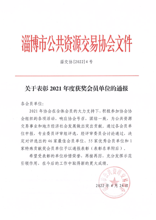 近日,淄博市公共資源交易協(xié)會(huì)通過各會(huì)員單元申報(bào),專業(yè)委員評(píng)審組評(píng)選,經(jīng)評(píng)審委員會(huì)討論通過后公布“關(guān)于表彰2021年度獲獎(jiǎng)會(huì)員單位的通報(bào)”的通知,中土物業(yè)淄博分公司憑借卓越的綜合實(shí)力榮獲“2021年度淄博市公共資源交易協(xié)會(huì)最佳單位”榮譽(yù)稱號(hào)。
