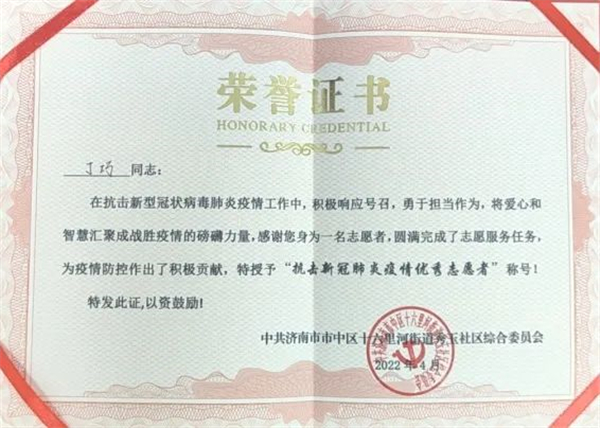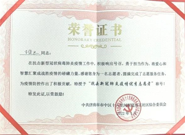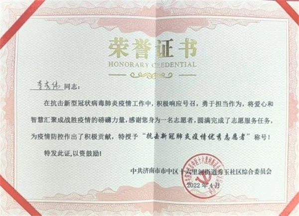 濟(jì)南市興隆家園小區(qū)物業(yè)管理處員工李秀偉、丁巧、王駿業(yè),在疫情防控工作中勇于擔(dān)當(dāng)作為,圓滿完成了社區(qū)志愿服務(wù)活動,被中共濟(jì)南市市中區(qū)十六里河街道秀玉社區(qū)綜合委員會評為“抗擊新冠肺炎疫情優(yōu)秀志愿者”榮譽(yù)稱號。